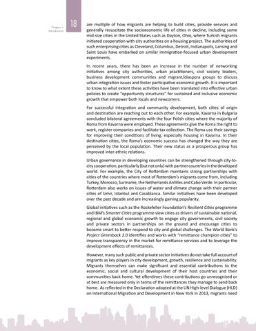 are multiple of how migrants are helping to build cities, provide services and generally resuscitate the socioeconomic life of cities in decline, including some mid-size cities in the United States such as Dayton, Ohio, where Turkish migrants initiated cooperation with city authorities on a housing project. The authorities of such enterprising cities as Cleveland, Columbus, Detroit, Indianapolis, Lansing and Saint Louis have embarked on similar immigration-focused urban development experiments. In recent years, there has been an increase in the number of networking initiatives among city authorities, urban practitioners, civil society leaders, business development communities and migrant/diaspora groups to discuss urban integration issues and foster participative economic growth. It is important to know to what extent these activities have been translated into effective urban policies to create “opportunity structures” for sustained and inclusive economic growth that empower both locals and newcomers. For successful integration and community development, both cities of origin and destination are reaching out to each other. For example, Kavarna in Bulgaria concluded bilateral agreements with the four Polish cities where the majority of Roma from Kavarna were employed. These agreements give the Roma the right to work, register companies and facilitate tax collection. The Roma use their savings for improving their conditions of living, especially housing in Kavarna. In their destination cities, the Roma’s economic success has changed the way they are perceived by the local population. Their new status as a prosperous group has improved inter-ethnic relations. Urban governance in developing countries can be strengthened through city-tocity cooperation, particularly (but not only) with partner countries in the developed world. For example, the City of Rotterdam maintains strong partnerships with cities of the countries where most of Rotterdam’s migrants come from, including Turkey, Morocco, Suriname, the Netherlands Antilles and Cabo Verde. In particular, Rotterdam also works on issues of water and climate change with their partner cities of Izmir, Istanbul and Casablanca. Similar initiatives have been developed over the past decade and are increasingly gaining popularity. Global initiatives such as the Rockefeller Foundation’s Resilient Cities programme and IBM’s Smarter Cities programme view cities as drivers of sustainable national, regional and global economic growth to engage city governments, civil society and private sectors in partnerships on the ground and encourage cities to become smart to better respond to city and global challenges. The World Bank’s Project Greenback 2.0 identifies and works with “remittance champion cities” to improve transparency in the market for remittance services and to leverage the development effects of remittances. However, many such public and private sector initiatives do not take full account of migrants as key players in city development, growth, resilience and sustainability. Migrants themselves can make significant and essential contributions to the economic, social and cultural development of their host countries and their communities back home. Yet oftentimes these contributions go unrecognized or at best are measured only in terms of the remittances they manage to send back home. As reflected in the Declaration adopted at the UN High-level Dialogue (HLD) on International Migration and Development in New York in 2013, migrants need