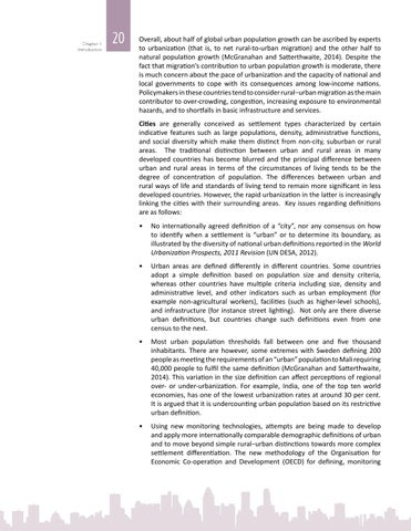 Overall, about half of global urban population growth can be ascribed by experts to urbanization (that is, to net rural-to-urban migration) and the other half to natural population growth (McGranahan and Satterthwaite, 2014). Despite the fact that migration’s contribution to urban population growth is moderate, there is much concern about the pace of urbanization and the capacity of national and local governments to cope with its consequences among low-income nations. Policymakers in these countries tend to consider rural–urban migration as the main contributor to over-crowding, congestion, increasing exposure to environmental hazards, and to shortfalls in basic infrastructure and services. Cities are generally conceived as settlement types characterized by certain indicative features such as large populations, density, administrative functions, and social diversity which make them distinct from non-city, suburban or rural areas. The traditional distinction between urban and rural areas in many developed countries has become blurred and the principal difference between urban and rural areas in terms of the circumstances of living tends to be the degree of concentration of population. The differences between urban and rural ways of life and standards of living tend to remain more significant in less developed countries. However, the rapid urbanization in the latter is increasingly linking the cities with their surrounding areas. Key issues regarding definitions are as follows: • No internationally agreed definition of a “city”, nor any consensus on how to identify when a settlement is “urban” or to determine its boundary, as illustrated by the diversity of national urban definitions reported in the World Urbanization Prospects, 2011 Revision (UN DESA, 2012). • Urban areas are defined differently in different countries. Some countries adopt a simple definition based on population size and density criteria, whereas other countries have multiple criteria including size, density and administrative level, and other indicators such as urban employment (for example non-agricultural workers), facilities (such as higher-level schools), and infrastructure (for instance street lighting). Not only are there diverse urban definitions, but countries change such definitions even from one census to the next. • Most urban population thresholds fall between one and five thousand inhabitants. There are however, some extremes with Sweden defining 200 people as meeting the requirements of an “urban” population to Mali requiring 40,000 people to fulfil the same definition (McGranahan and Satterthwaite, 2014). This variation in the size definition can affect perceptions of regional over- or under-urbanization. For example, India, one of the top ten world economies, has one of the lowest urbanization rates at around 30 per cent. It is argued that it is undercounting urban population based on its restrictive urban definition. • Using new monitoring technologies, attempts are being made to develop and apply more internationally comparable demographic definitions of urban and to move beyond simple rural–urban distinctions towards more complex settlement differentiation. The new methodology of the Organisation for Economic Co-operation and Development (OECD) for defining, monitoring