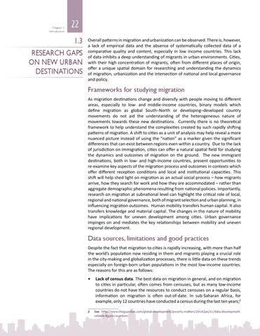 Frameworks for studying migration As migration destinations change and diversify with people moving to different areas, especially to low- and middle-income countries, binary models which define migration as global South–North or developing–developed country movements do not aid the understanding of the heterogeneous nature of movements towards these new destinations. Currently there is no theoretical framework to help understand the complexities created by such rapidly shifting patterns of migration. A shift to cities as a unit of analysis may help reveal a more nuanced picture instead of using the “nation” as a marker given the significant differences that can exist between regions even within a country. Due to the lack of jurisdiction on immigration, cities can offer a natural spatial field for studying the dynamics and outcomes of migration on the ground. The new immigrant destinations, both in low- and high-income countries, present opportunities to re-examine key aspects of the migration process and outcomes in contexts which offer different reception conditions and local and institutional capacities. This shift will help shed light on migration as an actual social process – how migrants arrive, how they search for work and how they are accommodated – rather than aggregate demographic phenomena resulting from national policies. Importantly, research on migration at subnational level can highlight the critical role of local, regional and national governance, both of migrant selection and urban planning, in influencing migration outcomes. Human mobility transfers human capital. It also transfers knowledge and material capital. The changes in the nature of mobility have implications for uneven development among cities. Urban governance impinges on and mediates the key relationships between mobility and uneven regional development.