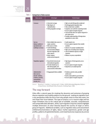 The way forward Cities offer a natural space for studying the dynamics and outcomes of growing diverse migration and mobility patterns on the ground. Looking at migration from a city perspective shifts the focus from why people move to how they work, live and shape their local habitats. This type of enquiry is at a nascent stage and has major limitations due to the critical lack of available, accurate, comprehensive and comparable data (Winders, 2014). Such migration enquiries need to highlight multiple dimensions of urban diversity beyond the country of origin or ethnic group of migrants. Additional variables, such as migration status and concomitant entitlements/restrictions of rights, labour market experiences, gender and age profiles, patterns of spatial distribution, and mixed local area responses by service
