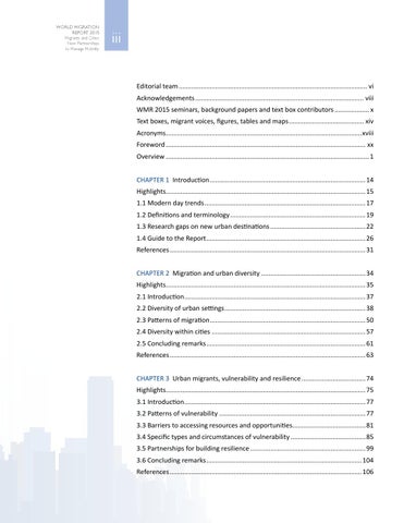 iii Editorial team........................................................................................................ vi Acknowledgements............................................................................................. viii WMR 2015 seminars, background papers and text box contributors.................... x Text boxes, migrant voices, figures, tables and maps.......................................... xiv Acronyms............................................................................................................xviii Foreword.............................................................................................................. xx Overview................................................................................................................ 1 CHAPTER 1 Introduction...................................................................................... 14 Highlights.............................................................................................................. 15 1.1 Modern day trends......................................................................................... 17 1.2 Definitions and terminology...........................................................................19 1.3 Research gaps on new urban destinations.....................................................22 1.4 Guide to the Report........................................................................................ 26 References............................................................................................................ 31 CHAPTER 2 Migration and urban diversity..........................................................34 Highlights.............................................................................................................. 35 2.1 Introduction.................................................................................................... 37 2.2 Diversity of urban settings.............................................................................. 38 2.3 Patterns of migration...................................................................................... 50 2.4 Diversity within cities..................................................................................... 57 2.5 Concluding remarks........................................................................................ 61 References............................................................................................................ 63 CHAPTER 3 Urban migrants, vulnerability and resilience....................................74 Highlights.............................................................................................................. 75 3.1 Introduction.................................................................................................... 77 3.2 Patterns of vulnerability................................................................................. 77 3.3 Barriers to accessing resources and opportunities.........................................81 3.4 Specific types and circumstances of vulnerability..........................................85 3.5 Partnerships for building resilience................................................................99 3.6 Concluding remarks...................................................................................... 104 References.......................................................................................................... 106