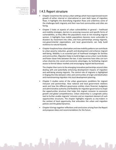 29 1.4.3. Report structure • Chapter 2 examines the various urban settings which have experienced recent growth of either internal or international or even both types of migration flows. It highlights the diversifying migration flows and underlines some of the challenges both migrants and their new host communities and cities are facing. • Chapter 3 looks at aspects of urban vulnerabilities in general – livelihood and mobility strategies, barriers to accessing resources and specific forms of vulnerabilities, as they affect the populations most at risk including migrant women. It highlights how mobile populations become more vulnerable to disasters by movement into cities, and how partnerships among migrants, non-governmental organizations and local governments can help build resilience to natural hazards. • Chapter 4 explores how urbanization and new mobility patterns can contribute to urban poverty reduction, growth and development and enhance migrant well-being. Mobility is an essential part of livelihood strategies for families and communities. Migration helps to build bridges across urban–rural divides and foster closer links between the two. It also examines how cities can turn urban diversity into social and economic advantages, by facilitating migrant access to formal labour markets and encouraging migrant-led businesses.