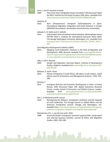 Hunt, J. and M. Gauthier-Loiselle 2009 How much does immigration boost innovation? IZA Discussion Paper No 3921. Institute for the Study of Labour (IZA), Bonn. Available from www.econstor.eu/bitstream/10419/35709/1/589802992.pdf Irastorza, N. 2010 Born Entrepreneurs? Immigrant Self-Employment in Spain. International Migration, Integration and Social Cohesion in Europe (IMISCOE) Dissertations. Amsterdam University Press, Amsterdam. Jedwab, R., D. Gollin and D. Vollrath, 2013 Urbanization with and without Industrialization. Working Paper Series IIEP-WP 2014–1, Institute for International Economic Policy (IIEP), The George Washington University, Washington, D.C. Available from www.gwu.edu/~iiep/assets/docs/papers/Jedwab_IIEPWP_2014-1. pdf Joint Migration Development Initiative (JMDI) 2013 Mapping Local Authorities’ Practices in the Area of Migration and Development. JMDI, Brussels. Available from www.migration4development.org/content/mapping-local-authorities%E2%80%99-practices-area-migration-and-development-new-jmdi-report Jolly, S. and H. Reevew 2005 Gender and Migration: Overview Report. Institute of Development Studies, Brighton. Available from www.bridge.ids.ac.uk/reports/CEPMig-OR.pdf. Kalitanyi, V. and K. Visser 2010 African Immigrants in South Africa: Job takers or job creators. South African Journal of Economic and Management Sciences, 13(4): 376– 390. Kemeny, T. Immigrant Diversity and Economic Development in Cities: A Critical 2013 Review. SERC Discussion Paper 149. Spatial Economics Research Centre, London School of Economics and Political Science, London. Available from www.spatialeconomics.ac.uk/textonly/SERC/ publications/download/sercdp0149.pdf Kerr, J., P. McDaniel and M. Guinan Reimagining the Midwest: Immigration Initiatives and the Capacity 2014 of Local Leadership. The Chicago Council on Global Affairs and the American Immigration Council, Chicago and Washington, D.C. Available from www.thechicagocouncil.org/publication/reimaginingmidwest-immigration-initiatives-and-capacity-local-leadership Kloosterman, R.C., J. van de Leun and J. Rath Across the border: immigrants’ economic opportunities, social capital 1998 and informal business activities. Journal of Ethnic and Migration Studies, 24(2): 249–268.