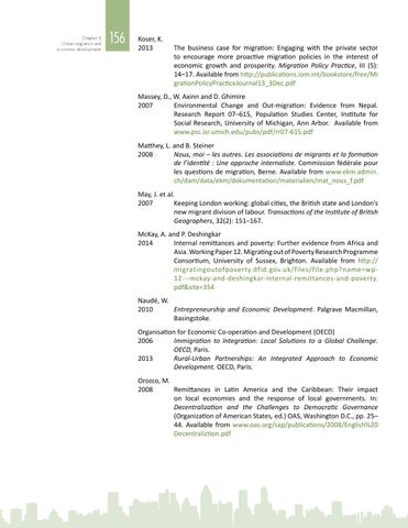 Massey, D., W. Axinn and D. Ghimire 2007 Environmental Change and Out-migration: Evidence from Nepal. Research Report 07–615, Population Studies Center, Institute for Social Research, University of Michigan, Ann Arbor. Available from www.psc.isr.umich.edu/pubs/pdf/rr07-615.pdf Matthey, L. and B. Steiner 2008 Nous, moi – les autres. Les associations de migrants et la formation de l’identité : Une approche internaliste. Commission fédérale pour les questions de migration, Berne. Available from www.ekm.admin. ch/dam/data/ekm/dokumentation/materialien/mat_nous_f.pdf May, J. et al. 2007 Keeping London working: global cities, the British state and London’s new migrant division of labour. Transactions of the Institute of British Geographers, 32(2): 151–167. McKay, A. and P. Deshingkar 2014 Internal remittances and poverty: Further evidence from Africa and Asia. Working Paper 12. Migrating out of Poverty Research Programme Consortium, University of Sussex, Brighton. Available from http:// migratingoutofpoverty.dfid.gov.uk/files/file.php?name=wp12---mckay-and-deshingkar-internal-remittances-and-poverty. pdf&site=354 Naudé, W. 2010 Entrepreneurship and Economic Development. Palgrave Macmillan, Basingstoke. Organisation for Economic Co-operation and Development (OECD) 2006 Immigration to Integration: Local Solutions to a Global Challenge. OECD, Paris. Rural-Urban Partnerships: An Integrated Approach to Economic 2013 Development. OECD, Paris. Orozco, M. 2008 Remittances in Latin America and the Caribbean: Their impact on local economies and the response of local governments. In: Decentralization and the Challenges to Democratic Governance (Organization of American States, ed.) OAS, Washington D.C., pp. 25– 44. Available from www.oas.org/sap/publications/2008/English%20 Decentraliztion.pdf
