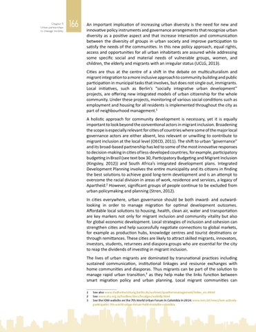 An important implication of increasing urban diversity is the need for new and innovative policy instruments and governance arrangements that recognize urban diversity as a positive aspect and that increase interaction and communication between the diversity of groups in urban society and improve participation to satisfy the needs of the communities. In this new policy approach, equal rights, access and opportunities for all urban inhabitants are assured while addressing some specific social and material needs of vulnerable groups, women, and children, the elderly and migrants with an irregular status (UCLG, 2013). Cities are thus at the centre of a shift in the debate on multiculturalism and migrant integration to a more inclusive approach to community building and public participation in municipal tasks that involves, but does not single out, immigrants. Local initiatives, such as Berlin’s “socially integrative urban development” projects, are offering new integrated models of urban citizenship for the whole community. Under these projects, monitoring of various social conditions such as employment and housing for all residents is implemented throughout the city as part of neighbourhood management.1 A holistic approach for community development is necessary, yet it is equally important to look beyond the conventional actors in migrant inclusion. Broadening the scope is especially relevant for cities of countries where some of the major local governance actors are either absent, less relevant or unwilling to contribute to migrant inclusion at the local level (OECD, 2011). The shift to urban “governance” and its broad-based partnership has led to some of the most innovative responses to decision-making in cities of less-developed countries, for example, participatory budgeting in Brazil (see text box 30, Participatory Budgeting and Migrant Inclusion (Kingsley, 2012)) and South Africa’s integrated development plans. Integrated Development Planning involves the entire municipality and its citizens in finding the best solutions to achieve good long-term development and is an attempt to overcome the racial division in areas of work, residence and services, a legacy of Apartheid.2 However, significant groups of people continue to be excluded from urban policymaking and planning (Stren, 2012). In cities everywhere, urban governance should be both inward- and outwardlooking in order to manage migration for optimal development outcomes. Affordable local solutions to housing, health, clean air, water and transportation are key markers not only for migrant inclusion and community vitality but also for global economic development. Local strategies of inclusion and cohesion can strengthen cities and help successfully negotiate connections to global markets, for example as production hubs, knowledge centres and tourist destinations or through remittances. These cities are likely to attract skilled migrants, innovators, investors, students, returnees and diaspora groups who are essential for the city to reap the dividends of investing in migrant inclusion. The lives of urban migrants are dominated by transnational practices including sustained communication, institutional linkages and resource exchanges with home communities and diasporas. Thus migrants can be part of the solution to manage rapid urban transition,3 as they help make the links function between smart migration policy and urban planning. Local migrant communities can 1 2 3
