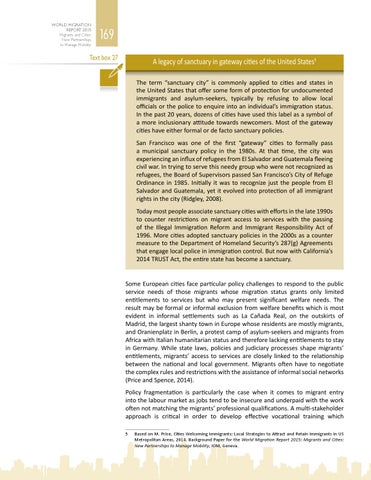 A legacy of sanctuary in gateway cities of the United States5 The term “sanctuary city” is commonly applied to cities and states in the United States that offer some form of protection for undocumented immigrants and asylum-seekers, typically by refusing to allow local officials or the police to enquire into an individual’s immigration status. In the past 20 years, dozens of cities have used this label as a symbol of a more inclusionary attitude towards newcomers. Most of the gateway cities have either formal or de facto sanctuary policies. San Francisco was one of the first “gateway” cities to formally pass a municipal sanctuary policy in the 1980s. At that time, the city was experiencing an influx of refugees from El Salvador and Guatemala fleeing civil war. In trying to serve this needy group who were not recognized as refugees, the Board of Supervisors passed San Francisco’s City of Refuge Ordinance in 1985. Initially it was to recognize just the people from El Salvador and Guatemala, yet it evolved into protection of all immigrant rights in the city (Ridgley, 2008). Today most people associate sanctuary cities with efforts in the late 1990s to counter restrictions on migrant access to services with the passing of the Illegal Immigration Reform and Immigrant Responsibility Act of 1996. More cities adopted sanctuary policies in the 2000s as a counter measure to the Department of Homeland Security’s 287(g) Agreements that engage local police in immigration control. But now with California’s 2014 TRUST Act, the entire state has become a sanctuary. Some European cities face particular policy challenges to respond to the public service needs of those migrants whose migration status grants only limited entitlements to services but who may present significant welfare needs. The result may be formal or informal exclusion from welfare benefits which is most evident in informal settlements such as La Cañada Real, on the outskirts of Madrid, the largest shanty town in Europe whose residents are mostly migrants, and Oranienplatz in Berlin, a protest camp of asylum-seekers and migrants from Africa with Italian humanitarian status and therefore lacking entitlements to stay in Germany. While state laws, policies and judiciary processes shape migrants’ entitlements, migrants’ access to services are closely linked to the relationship between the national and local government. Migrants often have to negotiate the complex rules and restrictions with the assistance of informal social networks (Price and Spence, 2014). Policy fragmentation is particularly the case when it comes to migrant entry into the labour market as jobs tend to be insecure and underpaid with the work often not matching the migrants’ professional qualifications. A multi-stakeholder approach is critical in order to develop effective vocational training which 5
