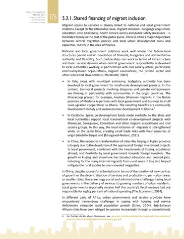 173 5.3.1. Shared financing of migrant inclusion Migrant access to services is closely linked to national and local government relations. Except for the citizenship issue, migrant inclusion – language acquisition, education, civic awareness, health service access and public safety measures – is facilitated locally at the cost of the public purse. There is often a major disjuncture between central migration policies and local urban development plans and capacities, mostly in the area of finance. National and local government relations work well where the federal-local structures permit certain devolution of financial, budgetary and administrative authority and flexibility. Such partnerships can work in terms of infrastructure and basic service delivery when central government responsibility is devolved to local authorities working in partnerships with civil society actors, particularly community-based organizations, migrant associations, the private sector and other interested stakeholders (UN-Habitat, 2007). • In Italy, along with municipal autonomy, budgetary authority has been devolved to local government for small-scale development projects. In this context, translocal projects involving diasporas and private entrepreneurs are thriving in partnership with communities in the origin countries. The Ghanacoop project, for example, involves Ghanaian migrants in the Italian province of Modena as partners with local government and business in small scale agrarian cooperatives in Ghana. The resulting benefits are community development in Italy and socioeconomic development in Ghana.8 • In Catalonia, Spain, co-development funds made available by the State and local authorities support local transnational co-development projects with Moroccan, Senegalese, Colombian and other migrant associations and civil society groups. In this way, the local inclusion of migrants is strengthened while, at the same time, creating small trade links with their countries of origin (Acebillo-Baqué and Østergaard-Nielsen, 2011). • In China, the economic transformation of cities like Fuqing in Fujian province is largely due to the devolution of the approval of foreign investment projects to local government, combined with the investments of Fuqing expatriates abroad, and flexibility by local government towards foreign investors. The growth in Fuqing and elsewhere has boosted education and created jobs, including for the many internal migrants from rural areas. It has also helped mitigate the rural exodus to over-crowded megacities. In China, despite successful urbanization in terms of the creation of new centres of growth or the decentralization of services and production to peri-urban areas or smaller cities, there are huge social and administrative challenges facing local governments in the delivery of services to growing numbers of urban residents. Local governments reportedly receive half the country’s fiscal revenue but are responsible for eighty per cent of national spending (The Economist, 2014). In different parts of Africa, urban governments and service providers have encountered tremendous challenges in coping with housing and service deficiencies alongside rapid population growth (Stren, 2014). Sub-Saharan African cities have been obliged to operate increasingly through a decentralized, 8
