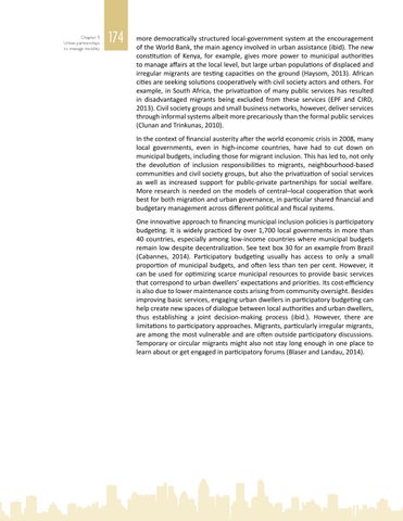 more democratically structured local-government system at the encouragement of the World Bank, the main agency involved in urban assistance (ibid). The new constitution of Kenya, for example, gives more power to municipal authorities to manage affairs at the local level, but large urban populations of displaced and irregular migrants are testing capacities on the ground (Haysom, 2013). African cities are seeking solutions cooperatively with civil society actors and others. For example, in South Africa, the privatization of many public services has resulted in disadvantaged migrants being excluded from these services (EPF and CIRD, 2013). Civil society groups and small business networks, however, deliver services through informal systems albeit more precariously than the formal public services (Clunan and Trinkunas, 2010). In the context of financial austerity after the world economic crisis in 2008, many local governments, even in high-income countries, have had to cut down on municipal budgets, including those for migrant inclusion. This has led to, not only the devolution of inclusion responsibilities to migrants, neighbourhood-based communities and civil society groups, but also the privatization of social services as well as increased support for public-private partnerships for social welfare. More research is needed on the models of central–local cooperation that work best for both migration and urban governance, in particular shared financial and budgetary management across different political and fiscal systems. One innovative approach to financing municipal inclusion policies is participatory budgeting. It is widely practiced by over 1,700 local governments in more than 40 countries, especially among low-income countries where municipal budgets remain low despite decentralization. See text box 30 for an example from Brazil (Cabannes, 2014). Participatory budgeting usually has access to only a small proportion of municipal budgets, and often less than ten per cent. However, it can be used for optimizing scarce municipal resources to provide basic services that correspond to urban dwellers’ expectations and priorities. Its cost-efficiency is also due to lower maintenance costs arising from community oversight. Besides improving basic services, engaging urban dwellers in participatory budgeting can help create new spaces of dialogue between local authorities and urban dwellers, thus establishing a joint decision-making process (ibid.). However, there are limitations to participatory approaches. Migrants, particularly irregular migrants, are among the most vulnerable and are often outside participatory discussions. Temporary or circular migrants might also not stay long enough in one place to learn about or get engaged in participatory forums (Blaser and Landau, 2014).