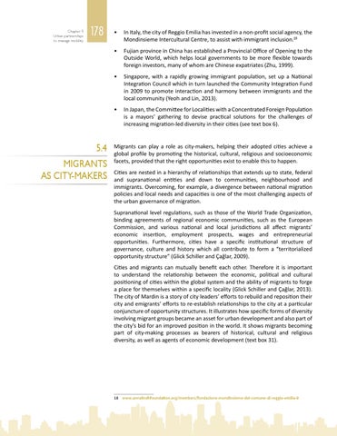 • In Italy, the city of Reggio Emilia has invested in a non-profit social agency, the Mondinsieme Intercultural Centre, to assist with immigrant inclusion.18 • Fujian province in China has established a Provincial Office of Opening to the Outside World, which helps local governments to be more flexible towards foreign investors, many of whom are Chinese expatriates (Zhu, 1999). • Singapore, with a rapidly growing immigrant population, set up a National Integration Council which in turn launched the Community Integration Fund in 2009 to promote interaction and harmony between immigrants and the local community (Yeoh and Lin, 2013). • In Japan, the Committee for Localities with a Concentrated Foreign Population is a mayors’ gathering to devise practical solutions for the challenges of increasing migration-led diversity in their cities (see text box 6).