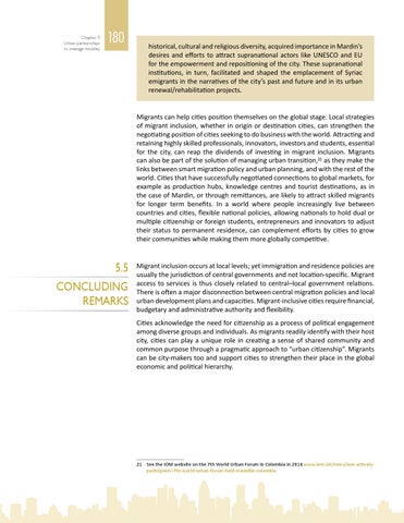 historical, cultural and religious diversity, acquired importance in Mardin’s desires and efforts to attract supranational actors like UNESCO and EU for the empowerment and repositioning of the city. These supranational institutions, in turn, facilitated and shaped the emplacement of Syriac emigrants in the narratives of the city’s past and future and in its urban renewal/rehabilitation projects. Migrants can help cities position themselves on the global stage. Local strategies of migrant inclusion, whether in origin or destination cities, can strengthen the negotiating position of cities seeking to do business with the world. Attracting and retaining highly skilled professionals, innovators, investors and students, essential for the city, can reap the dividends of investing in migrant inclusion. Migrants can also be part of the solution of managing urban transition,21 as they make the links between smart migration policy and urban planning, and with the rest of the world. Cities that have successfully negotiated connections to global markets, for example as production hubs, knowledge centres and tourist destinations, as in the case of Mardin, or through remittances, are likely to attract skilled migrants for longer term benefits. In a world where people increasingly live between countries and cities, flexible national policies, allowing nationals to hold dual or multiple citizenship or foreign students, entrepreneurs and innovators to adjust their status to permanent residence, can complement efforts by cities to grow their communities while making them more globally competitive.