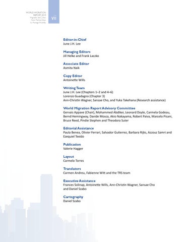vii Editor-in-Chief June J.H. Lee Managing Editors Jill Helke and Frank Laczko Associate Editor Asmita Naik Copy Editor Antoinette Wills Writing Team June J.H. Lee (Chapters 1–2 and 4–6) Lorenzo Guadagno (Chapter 3) Ann-Christin Wagner, Sansae Cho, and Yuka Takehana (Research assistance) World Migration Report Advisory Committee Gervais Appave (Chair), Mohammed Abdiker, Leonard Doyle, Carmela Godeau, Bernd Hemingway, Davide Mosca, Akio Nakayama, Robert Paiva, Marcelo Pisani, Bruce Reed, Pindie Stephen and Theodora Suter Editorial Assistance Paula Benea, Olivier Ferrari, Salvador Gutierrez, Barbara Rijks, Azzouz Samri and Ezequiel Texido Publication Valerie Hagger Layout Carmelo Torres Translators Carmen Andreu, Fabienne Witt and the TRS team Executive Assistance Frances Solinap, Antoinette Wills, Ann-Christin Wagner, Sansae Cho and Daniel Szabo Cartography Daniel Szabo