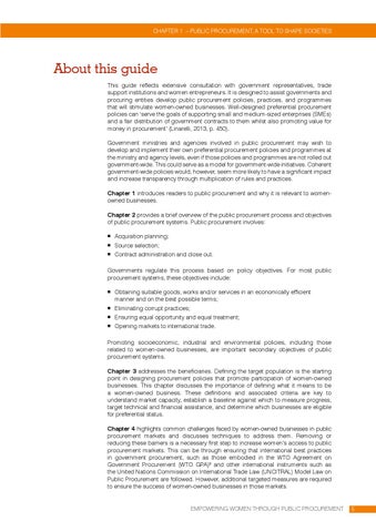 About this guide This guide reflects extensive consultation with government representatives, trade support institutions and women entrepreneurs. It is designed to assist governments and procuring entities develop public procurement policies, practices, and programmes that will stimulate women-owned businesses. Well-designed preferential procurement policies can ‘serve the goals of supporting small and medium-sized enterprises (SMEs) and a fair distribution of government contracts to them whilst also promoting value for money in procurement’ (Linarelli, 2013, p. 450). Government ministries and agencies involved in public procurement may wish to develop and implement their own preferential procurement policies and programmes at the ministry and agency levels, even if those policies and programmes are not rolled out government-wide. This could serve as a model for government-wide initiatives. Coherent government-wide policies would, however, seem more likely to have a significant impact and increase transparency through multiplication of rules and practices. Chapter 1 introduces readers to public procurement and why it is relevant to womenowned businesses. Chapter 2 provides a brief overview of the public procurement process and objectives of public procurement systems. Public procurement involves: Acquisition planning; Source selection; Contract administration and close out. Governments regulate this process based on policy objectives. For most public procurement systems, these objectives include: Obtaining suitable goods, works and/or services in an economically efficient manner and on the best possible terms; Eliminating corrupt practices; Ensuring equal opportunity and equal treatment; Opening markets to international trade. Promoting socioeconomic, industrial and environmental policies, including those related to women-owned businesses, are important secondary objectives of public procurement systems. Chapter 3 addresses the beneficiaries. Defining the target population is the starting point in designing procurement policies that promote participation of women-owned businesses. This chapter discusses the importance of defining what it means to be a women-owned business. These definitions and associated criteria are key to understand market capacity, establish a baseline against which to measure progress, target technical and financial assistance, and determine which businesses are eligible for preferential status. Chapter 4 highlights common challenges faced by women-owned businesses in public procurement markets and discusses techniques to address them. Removing or reducing these barriers is a necessary first step to increase women’s access to public procurement markets. This can be through ensuring that international best practices in government procurement, such as those embodied in the WTO Agreement on Government Procurement (WTO GPA)3 and other international instruments such as the United Nations Commission on International Trade Law (UNCITRAL) Model Law on Public Procurement are followed. However, additional targeted measures are required to ensure the success of women-owned businesses in those markets.