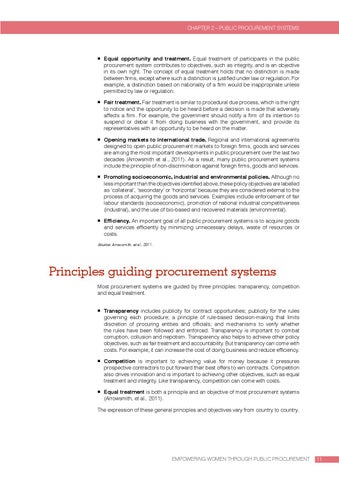 Principles guiding procurement systems Most procurement systems are guided by three principles: transparency, competition and equal treatment. Transparency includes publicity for contract opportunities; publicity for the rules governing each procedure; a principle of rule-based decision-making that limits discretion of procuring entities and officials; and mechanisms to verify whether the rules have been followed and enforced. Transparency is important to combat corruption, collusion and nepotism. Transparency also helps to achieve other policy objectives, such as fair treatment and accountability. But transparency can come with costs. For example, it can increase the cost of doing business and reduce efficiency. Competition is important to achieving value for money because it pressures prospective contractors to put forward their best offers to win contracts. Competition also drives innovation and is important to achieving other objectives, such as equal treatment and integrity. Like transparency, competition can come with costs. Equal treatment is both a principle and an objective of most procurement systems (Arrowsmith, et al., 2011). The expression of these general principles and objectives vary from country to country.