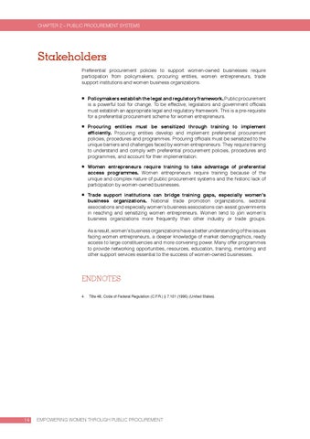 Stakeholders Preferential procurement policies to support women-owned businesses require participation from policymakers, procuring entities, women entrepreneurs, trade support institutions and women business organizations. Policymakers establish the legal and regulatory framework. Public procurement is a powerful tool for change. To be effective, legislators and government officials must establish an appropriate legal and regulatory framework. This is a pre-requisite for a preferential procurement scheme for women entrepreneurs. Procuring entities must be sensitized through training to implement efficiently. Procuring entities develop and implement preferential procurement policies, procedures and programmes. Procuring officials must be sensitized to the unique barriers and challenges faced by women entrepreneurs. They require training to understand and comply with preferential procurement policies, procedures and programmes, and account for their implementation. Women entrepreneurs require training to take advantage of preferential access programmes. Women entrepreneurs require training because of the unique and complex nature of public procurement systems and the historic lack of participation by women-owned businesses. Trade support institutions can bridge training gaps, especially women’s business organizations. National trade promotion organizations, sectoral associations and especially women’s business associations can assist governments in reaching and sensitizing women entrepreneurs. Women tend to join women’s business organizations more frequently than other industry or trade groups. As a result, women’s business organizations have a better understanding of the issues facing women entrepreneurs, a deeper knowledge of market demographics, ready access to large constituencies and more convening power. Many offer programmes to provide networking opportunities, resources, education, training, mentoring and other support services essential to the success of women-owned businesses.