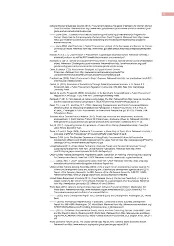 National Women’s Business Council (2013). Procurement Statistics Revealed Great Gains for Women-Owned Small Businesses. Retrieved from http://www.nwbc.gov/research/procurement-statistics-revealed-greatgains-women-owned-small-businesses. -------- (June 2009). Successful Practices for Establishing and Modifying Entrepreneurship Programs for Women: Resources for Entrepreneurship Centers & Non-Credit Programs. Retrieved from https://www. nwbc.gov/research/successful-practices-establishing-and-modifying-entrepreneurship-programswomen-resources. -------- (June 2006). Best Practices in Federal Procurement: A Study of the Successes and Barriers for WomenOwned Businesses. Retrieved from http://www.nwbc.gov/sites/default/files/osdbubestpracticesreportfin. pdf. Nielsen, R. (n.d.). EU Discrimination in Procurement. Copenhagen Business School. Retrieved from http:// arbetsratt.juridicum.su.se/Filer/PDF/klaw46/discrimination.procurement.pdf Novirianti, D. (2013). Gender and Government Procurement in Indonesia (Gender Vendor Survey)(Presentation slides). Millennium Challenge Account-Indonesia. Retrieved from http://smefinanceforum.org/post/ gender-and-government-procurement-in-indonesia-gender-vendor-survey. Orser, B. (March 2009). Procurement Strategies to Support Women-Owned Enterprises. Retrieved from http://www.weconnectcanada.org/uploads/File/ CanadaWorksMarch302009WEConnectCanadaProcurementStudy.pdf. Practical Law (2013). Public Procurement in Brazil: Overview. Retrieved from http://us.practicallaw.com/6-5214700?source=relatedcontent. Quinot, G. (2013). Promotion of Social Policy Through Public Procurement in Africa. In G. Quinot & S. Arrowsmith (eds.), Public Procurement Regulation in Africa (pp. 370-403). New York: Cambridge University Press. Quinot, G. and S. Arrowsmith (2013). Introduction. In G. Quinot & S. Arrowsmith (eds.), Public Procurement Regulation in Africa (pp. 1-21). New York: Cambridge University Press. Rampedi, P. (2012). Firm cleaned up millions using helper. The Star. Retrieved from http://www.iol.co.za/thestar/firm-cleaned-up-millions-using-helper-1.1302575?ot=inmsa.ArticlePrintPageLayout.ot. Reed, T.S., Luna, P.G., and Pike, W.C. (2005). Balancing Socioeconomic and Public Procurement Reform: Effective Metrics for Measuring Small Business Participation in Public Procurement. In K.V. Thai, et al. (eds.), Challenges in Public Procurement: an International Perspective (pp. 81-100). Florida, USA: PrAcademics Press. Southern Africa Gender Protocol Alliance (2012). Productive resources and employment, economic empowerment, in SADC Gender Protocol 2012 Barometer – Botswana (Chap. 4). Retrieved from http:// www.genderlinks.org.za/article/sadc-gender-protocol-2012-barometer---botswana-2012-11-29. Sun, B. (2012). Supporting Women Entrepreneurs – Phoenix Micro Startup (Presentation slide). Council of Labor Affairs, Executive Yuan. Taylor, J.D. and K. Roga (2009). Preferential Procurement: A Case Study of South Africa. Retrieved from http:// www.ippa.org/IPPC4/Proceedings/13ProcurementPreferences/Paper13-6.pdf. Teixiera, D.P.R. (n.d.). The Brazilian Experience of Using Public Procurement Policies to Promote the Development of Micro and Small Enterprises from the Legal Point of View. http://www.ippa.org/IPPC4/Pro ceedings/13ProcurementPreferences/Paper13-3.pdf. United Nations (2013). A New Global Partnership: Eradicate Poverty and Transform Economies Through Sustainable Development. New York: United Nations Publications. Retrieved from http://www. post2015hlp.org/wp-content/uploads/2013/05/UN-Report.pdf. UNDP (United Nations Development Programme) (2009). Handbook on Planning, Monitoring and Evaluating For Development Results. New York: UNDP. Retrieved from http://www.undp.org/eo/handbook. -------- (2002). RBM in UNDP: Selecting Indicators. New York: UNDP. Retrieved from http://web.undp.org/ evaluation/documents/methodology/rbm/indicators-Paperl.doc. UNGA (United Nations General Assembly) (2013). A life of dignity for all: accelerating progress towards the Millennium Development Goals and advancing the United Nations development agenda beyond 2015. Report of the Secretary General to the 68th Session of the UN General Assembly, A/68/202. UNGA. Retrieved from http://www.un.org/ga/search/view_doc.asp?symbol=A/68/202. United States Department of Justice (2013). Press Release, Security Contractors Plead Guilty in Virginia to Illegally Obtaining $31 Million from Contracts Intended for Disadvantaged Small Businesses. Retrieved from http://www.justice.gov/opa/pr/2013/March/13-crm-323.html. World Bank (2013). Ghana’s Comprehensive Approach to Public Procurement Reform. Washington DC: World Bank. Retrieved from http://www.worldbank.org/en/news/feature/2013/02/04/Ghana-8217-sComprehensive-Approach-to-Public-Procurement-Reform. --------- (2012). World Development Report 2012, Gender Equality and Development. Washington, DC: World Bank. --------- (2011a). Promoting Entrepreneurship in Botswana: Constraints to Micro Business Development. Report No. 59916-BW. Washington, DC: World Bank. Retrieved from http://siteresources.worldbank.org/ INTBOTSWANA/Resources/Promoting_Enterpeneurship_in_Botswana.pdf. -------- (2011b). Guidelines: Procurement of Goods, Works, and Non-Consulting Services Under IBRD Loans and IDA Credits & Grants. Washington DC: World Bank. Retrieved from http://siteresources.worldbank. org/INTPROCUREMENT/Resources/278019-1308067833011/Procurement_GLs_English_Final_Jan2011. pdf. World Economic Forum (2013). The Global Gender Gap Report 2013. Geneva: World Economic Forum. Retrieved from http://www.weforum.org/reports/global-gender-gap-report-2013.