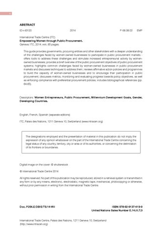 International Trade Centre (ITC) Empowering Women through Public Procurement. Geneva: ITC, 2014. xviii, 65 pages. This guide provides governments, procuring entities and other stakeholders with a deeper understanding of the challenges faced by women-owned businesses to participate in public procurement markets offers tools to address these challenges and stimulate increased entrepreneurial activity by womenowned businesses; provides a brief overview of the public procurement objectives of public procurement systems; highlights common challenges faced by women-owned businesses in public procurement markets and discusses techniques to address them; reviews affirmative action policies and programmes to build the capacity of women-owned businesses and to encourage their participation in public procurement; discusses metrics, monitoring and evaluating progress towards policy objectives, as well as enforcing compliance with preferential procurement policies; includes bibliographical references (pp. 64-65).