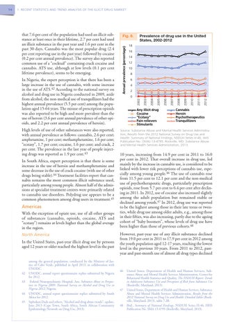10 years, increasing from 14.9 per cent in 2011 to 16.0 per cent in 2012. That overall increase in drug use, led mainly by the increase in cannabis use, is considered to be linked with lower risk perceptions of cannabis use, especially among young people.46 The use of cannabis rose from 11.5 per cent to 12.1 per cent and the non-medical use of psychotherapeutic drugs, particularly prescription opioids, rose from 5.7 per cent to 6.4 per cent after declining in 2011. In 2012, use of cocaine also increased slightly among the adult population but remained stable or declined among youth.47 In 2012, drug use was reported to be the highest among those in their late teens or twenties, while drug use among older adults, e.g., among those in their fifties, was also increasing, partly due to the ageing cohort of “baby boomers”, whose levels of drug use have been higher than those of previous cohorts.48 However, past-year use of any illicit substance declined from 19.0 per cent in 2011 to 17.9 per cent in 2012 among the youth population aged 12-17 years, reaching the lowest level in the previous 10 years. From 2011 to 2012, pastyear and past-month use of almost all drug types declined