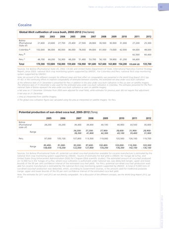 Sources: For Bolivia (Plurinational State of), 2002: CICAD and United States Department of State, International Narcotics Control Strategy Report; since 2003: national illicit crop monitoring system supported by UNODC. For Colombia and Peru: national illicit crop monitoring system supported by UNODC. Note: An account of the different concepts for different areas and their effect on comparability was presented in the World Drug Report 2012 (pp. 41-42). In the continuing efforts to improve comparability of estimates between countries, the estimated net area under coca bush cultivation at the reference date of 31 December is presented for Peru in addition to the area under coca bush cultivation in Peru as seen on satellite imagery. The reference date of 31 December is also used for the estimated area under coca bush cultivation in Colombia. The estimates presented for the Plurinational State of Bolivia represent the area under coca bush cultivation as seen on satellite imagery. a Net area on 31 December. Estimates from 2009 were adjusted for small fields, while estimates for previous years did not require that adjustment. b Net area on 31 December. c Area as interpreted from satellite imagery. d The global coca cultivation figure was calculated using the area as interpreted on satellite imagery for Peru.
