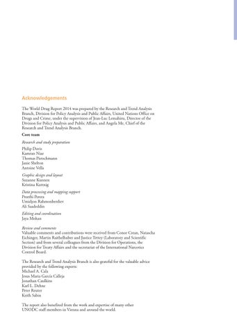 Acknowledgements The World Drug Report 2014 was prepared by the Research and Trend Analysis Branch, Division for Policy Analysis and Public Affairs, United Nations Office on Drugs and Crime, under the supervision of Jean-Luc Lemahieu, Director of the Division for Policy Analysis and Public Affairs, and Angela Me, Chief of the Research and Trend Analysis Branch. Core team Research and study preparation Philip Davis Kamran Niaz Thomas Pietschmann Janie Shelton Antoine Vella Graphic design and layout Suzanne Kunnen Kristina Kuttnig Data processing and mapping support Preethi Perera Umidjon Rahmonberdiev Ali Saadeddin Editing and coordination Jaya Mohan Review and comments Valuable comments and contributions were received from Conor Crean, Natascha Eichinger, Martin Raithelhuber and Justice Tettey (Laboratory and Scientific Section) and from several colleagues from the Division for Operations, the Division for Treaty Affairs and the secretariat of the International Narcotics Control Board. The Research and Trend Analysis Branch is also grateful for the valuable advice provided by the following experts: Michael A. Cala Jesus Maria GarcĂa Calleja Jonathan Caulkins Karl L. Dehne Peter Reuter Keith Sabin The report also benefited from the work and expertise of many other UNODC staff members in Vienna and around the world.