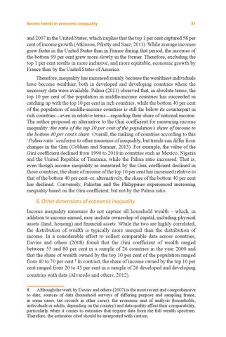 and 2007 in the United States, which implies that the top 1 per cent captured 58 per cent of income growth (Atkinson, Piketty and Saez, 2011). While average incomes grew faster in the United States than in France during that period, the incomes of the bottom 99 per cent grew more slowly in the former. Therefore, excluding the top 1 per cent results in more inclusive, and more equitable, economic growth by France than by the United States of America. Therefore, inequality has increased mainly because the wealthiest individuals have become wealthier, both in developed and developing countries where the necessary data were available. Palma (2011) observed that, in absolute terms, the top 10 per cent of the population in middle-income countries has succeeded in catching up with the top 10 per cent in rich countries, while the bottom 40 per cent of the population of middle-income countries is still far below its counterpart in rich countries—even in relative terms—regarding their share of national income. The author proposed an alternative to the Gini coefficient for measuring income inequality: the ratio of the top 10 per cent of the population’s share of income to the bottom 40 per cent’s share. Overall, the ranking of countries according to this ‘Palma ratio’ conforms to other measures of inequality, but trends can differ from changes in the Gini (Cobham and Sumner, 2013). For example, the value of the Gini coefficient declined from 1990 to 2010 in countries such as Mexico, Nigeria and the United Republic of Tanzania, while the Palma ratio increased. That is, even though income inequality as measured by the Gini coefficient declined in those countries, the share of income of the top 10 per cent has increased relative to that of the bottom 40 per cent–or, alternatively, the share of the bottom 40 per cent has declined. Conversely, Pakistan and the Philippines experienced increasing inequality based on the Gini coefficient, but not by the Palma ratio.