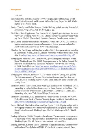 149-166. Besley,Timothy, and Ravi Kanbur (1990). The principles of targeting. World Bank Policy Research and External Affairs Working Paper, No.385. Washington, D.C.: World Bank. Besley, Timothy, and Robin Burgess (2003). Halving global poverty. Journal of Economic Perspectives, vol. 17, No.3, pp. 3-22. Bird, Kate, Kate Higgins and Dan Harris (2010). Spatial poverty traps: An overview. ODI Working Paper No. 321, Chronic Poverty Research Centre Working Paper No.161 (December). London: Overseas Development Institute. Bird, Karen, Thomas Saalfeld and Andreas M. Wüst, eds. (2010). The political representation of immigrants and minorities: Voters, parties and parliaments in liberal democracies. New York: Routledge. Blanden, Jo, Paul Gregg and Stephen Machin (2005). Intergenerational mobility in Europe and North America: A report supported by the Sutton Trust. Available from http://cep.lse.ac.uk/about/news/IntergenerationalMobility.pdf. Bourguignon, Francois (2004).The poverty-growth-inequality triangle. World Bank Working Paper, No. 28102. Paper presented at the Indian Council for Research on International Economic Relations, New Delhi, on February 4, 2004. Available from: http://www-wds.worldbank.org/external/default/ WDSContentServer/IW3P/IB/2004/03/09/000265513_20040309165330/ Rendered/PDF/28102.pdf. Bourguignon, François, Francisco H.G. Ferreira and Nora Lustig, eds. (2005). The Microeconomics of Income Distribution Dynamics in East Asia and Latin America. Washington D.C.: World Bank and New York: Oxford University Press. Bradbury, Bruce, Miles Corak, Jane Waldfogel and Elizabeth Washbrook (2012). Inequality in early childhood outcomes. In From Parents to Children: The Intergenerational Transmission of Advantage, J. Ermisch, M. Jäntti, & T. Smeeding, eds. New York: Russell Sage Foundation. Bradbury, Katherine (2011). Trends in US Family income mobility 1969-2006. Federal Reserve Bank of Boston Working Paper, No.11-10. Available from http://www.bostonfed.org/economic/wp/wp2011/wp1110.pdf. Bruno, Michael, Martin Ravallion, and Lyn Squire (1996). Equity and growth in developing countries: Old and new perspectives on the policy issues. World Bank Policy Research Working Paper, No.1563.Washington D.C.: World Bank. Buckup, Sebastian (2009). The price of exclusion: The economic consequences of excluding people with disabilities from the world of work. Employment Working Paper, No. 43. Geneva: International Labour Office. Buhaug, Halvard, Kristian Skrede Gleditsch, Helge Holtermann, Gudrun Østby and Andreas Forø Tollefsen (2011). It’s the local economy, stupid! Geo-