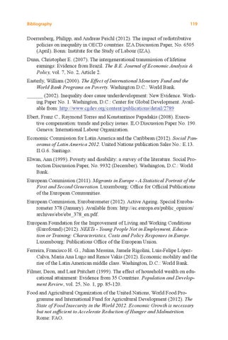Doerrenberg, Philipp, and Andreas Peichl (2012). The impact of redistributive policies on inequality in OECD countries. IZA Discussion Paper, No. 6505 (April). Bonn: Institute for the Study of Labour (IZA). Dunn, Christopher E. (2007). The intergenerational transmission of lifetime earnings: Evidence from Brazil. The B.E. Journal of Economic Analysis & Policy, vol. 7, No. 2, Article 2. Easterly, William (2000). The Effect of International Monetary Fund and the World Bank Programs on Poverty. Washington D.C.: World Bank. ______ (2002). Inequality does cause underdevelopment: New Evidence. Working Paper No. 1. Washington, D.C.: Center for Global Development. Available from: http://www.cgdev.org/content/publications/detail/2789 Ebert, Franz C., Raymond Torres and Konstantinos Papadakis (2008). Executive compensation: trends and policy issues. ILO Discussion Paper No. 190. Geneva: International Labour Organization. Economic Commission for Latin America and the Caribbean (2012). Social Panorama of Latin America 2012. United Nations publication Sales No.: E.13. II.G.6. Santiago. Elwan, Ann (1999). Poverty and disability: a survey of the literature. Social Protection Discussion Paper, No. 9932 (December). Washington, D.C.: World Bank. European Commission (2011). Migrants in Europe - A Statistical Portrait of the First and Second Generation. Luxembourg: Office for Official Publications of the European Communities. European Commission, Eurobarometer (2012). Active Ageing. Special Eurobarometer 378 (January). Available from: http://ec.europa.eu/public_opinion/ archives/ebs/ebs_378_en.pdf. European Foundation for the Improvement of Living and Working Conditions (Eurofound) (2012). NEETs - Young People Not in Employment, Education or Training: Characteristics, Costs and Policy Responses in Europe. Luxembourg: Publications Office of the European Union. Ferreira, Francisco H. G., Julian Messina, Jamele Rigolini, Luis-Felipe L贸pezCalva, Maria Ana Lugo and Renos Vakis (2012). Economic mobility and the rise of the Latin American middle class. Washington, D.C.: World Bank. Filmer, Deon, and Lant Pritchett (1999). The effect of household wealth on educational attainment: Evidence from 35 Countries. Population and Development Review, vol. 25, No. 1, pp. 85-120. Food and Agricultural Organization of the United Nations, World Food Programme and International Fund for Agricultural Development (2012). The State of Food Insecurity in the World 2012. Economic Growth is necessary but not sufficient to Accelerate Reduction of Hunger and Malnutrition. Rome: FAO.