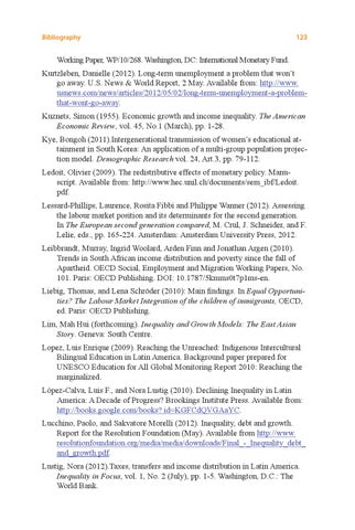 Working Paper, WP/10/268. Washington, DC: International Monetary Fund. Kurtzleben, Danielle (2012). Long-term unemployment a problem that won’t go away. U.S. News & World Report, 2 May. Available from: http://www. usnews.com/news/articles/2012/05/02/long-term-unemployment-a-problemthat-wont-go-away. Kuznets, Simon (1955). Economic growth and income inequality. The American Economic Review, vol. 45, No.1 (March), pp. 1-28. Kye, Bongoh (2011).Intergenerational transmission of women’s educational attainment in South Korea: An application of a multi-group population projection model. Demographic Research vol. 24, Art.3, pp. 79-112. Ledoit, Olivier (2009). The redistributive effects of monetary policy. Manuscript. Available from: http://www.hec.unil.ch/documents/sem_ibf/Ledoit. pdf. Lessard-Phillips, Laurence, Rosita Fibbi and Philippe Wanner (2012). Assessing the labour market position and its determinants for the second generation. In The European second generation compared, M. Crul, J. Schneider, and F. Lelie, eds., pp. 165-224. Amsterdam: Amsterdam University Press, 2012. Leibbrandt, Murray, Ingrid Woolard, Arden Finn and Jonathan Argen (2010). Trends in South African income distribution and poverty since the fall of Apartheid. OECD Social, Employment and Migration Working Papers, No. 101. Paris: OECD Publishing. DOI: 10.1787/5kmms0t7p1ms-en. Liebig, Thomas, and Lena Schröder (2010): Main findings. In Equal Opportunities? The Labour Market Integration of the children of immigrants, OECD, ed. Paris: OECD Publishing. Lim, Mah Hui (forthcoming). Inequality and Growth Models: The East Asian Story. Geneva: South Centre. Lopez, Luis Enrique (2009). Reaching the Unreached: Indigenous Intercultural Bilingual Education in Latin America. Background paper prepared for UNESCO Education for All Global Monitoring Report 2010: Reaching the marginalized. López-Calva, Luis F., and Nora Lustig (2010). Declining Inequality in Latin America: A Decade of Progress? Brookings Institute Press. Available from: http://books.google.com/books? id=KGFCdQVGAaYC. Lucchino, Paolo, and Sakvatore Morelli (2012). Inequality, debt and growth. Report for the Resolution Foundation (May). Available from http://www. resolutionfoundation.org/media/media/downloads/Final_-_Inequality_debt_ and_growth.pdf. Lustig, Nora (2012).Taxes, transfers and income distribution in Latin America. Inequality in Focus, vol. 1, No. 2 (July), pp. 1-5. Washington, D.C.: The World Bank.