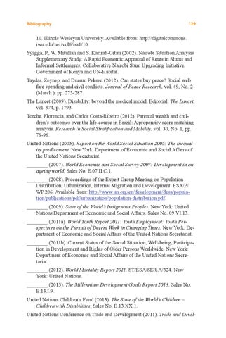 10. Illinois Wesleyan University. Available from: http://digitalcommons. iwu.edu/uer/vol6/iss1/10. Syagga, P., W. Mitullah and S. Karirah-Gitau (2002). Nairobi Situation Analysis Supplementary Study: A Rapid Economic Appraisal of Rents in Slums and Informal Settlements. Collaborative Nairobi Slum Upgrading Initiative, Government of Kenya and UN-Habitat. Taydas, Zeynep, and Dursun Peksen (2012). Can states buy peace? Social welfare spending and civil conflicts. Journal of Peace Research, vol. 49, No. 2 (March ), pp. 273-287. The Lancet (2009). Disability: beyond the medical model. Editorial. The Lancet, vol. 374, p. 1793. Torche, Florencia, and Carlos Costa-Ribeiro (2012). Parental wealth and children’s outcomes over the life-course in Brazil: A propensity score matching analysis. Research in Social Stratification and Mobility, vol. 30, No. 1, pp. 79-96. United Nations (2005). Report on the World Social Situation 2005: The inequality predicament. New York: Department of Economic and Social Affairs of the United Nations Secretariat. ________ (2007). World Economic and Social Survey 2007: Development in an ageing world. Sales No. E.07.II.C.1. ________ (2008). Proceedings of the Expert Group Meeting on Population Distribution, Urbanization, Internal Migration and Development. ESA/P/ WP.206. Available from: http://www.un.org/en/development/desa/population/publications/pdf/urbanization/population-distribution.pdf. ________ (2009). State of the World’s Indigenous Peoples. New York: United Nations Department of Economic and Social Affairs. Sales No. 09.VI.13. ________ (2011a). World Youth Report 2011: Youth Employment: Youth Perspectives on the Pursuit of Decent Work in Changing Times. New York: Department of Economic and Social Affairs of the United Nations Secretariat. ________ (2011b). Current Status of the Social Situation, Well-being, Participation in Development and Rights of Older Persons Worldwide. New York: Department of Economic and Social Affairs of the United Nations Secretariat. ________ (2012). World Mortality Report 2011. ST/ESA/SER.A/324. New York: United Nations. ________ (2013). The Millennium Development Goals Report 2013. Sales No. E.13.I.9. United Nations Children’s Fund (2013). The State of the World’s Children – Children with Disabilities. Sales No. E.13.XX.1. United Nations Conference on Trade and Development (2011). Trade and Devel-