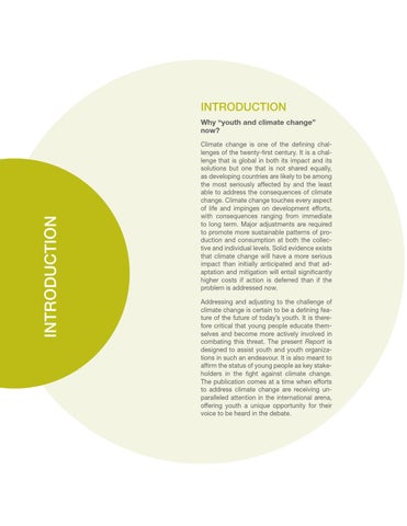 Why “youth and climate change� now? Climate change is one of the defining challenges of the twenty-first century. It is a challenge that is global in both its impact and its solutions but one that is not shared equally, as developing countries are likely to be among the most seriously affected by and the least able to address the consequences of climate change. Climate change touches every aspect of life and impinges on development efforts, with consequences ranging from immediate to long term. Major adjustments are required to promote more sustainable patterns of production and consumption at both the collective and individual levels. Solid evidence exists that climate change will have a more serious impact than initially anticipated and that adaptation and mitigation will entail significantly higher costs if action is deferred than if the problem is addressed now. Addressing and adjusting to the challenge of climate change is certain to be a defining feature of the future of today’s youth. It is therefore critical that young people educate themselves and become more actively involved in combating this threat. The present Report is designed to assist youth and youth organizations in such an endeavour. It is also meant to affirm the status of young people as key stakeholders in the fight against climate change. The publication comes at a time when efforts to address climate change are receiving unparalleled attention in the international arena, offering youth a unique opportunity for their voice to be heard in the debate.