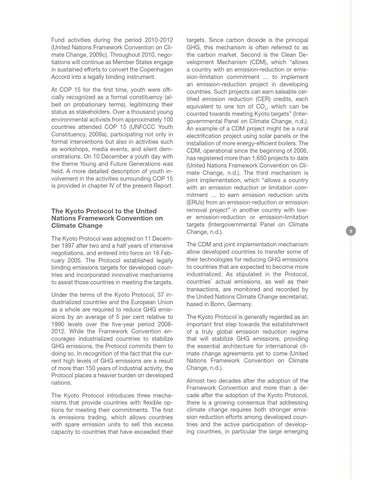 targets. Since carbon dioxide is the principal GHG, this mechanism is often referred to as the carbon market. Second is the Clean Development Mechanism (CDM), which “allows a country with an emission-reduction or emission-limitation commitment … to implement an emission-reduction project in developing countries. Such projects can earn saleable certified emission reduction (CER) credits, each equivalent to one ton of CO2, which can be counted towards meeting Kyoto targets” (Intergovernmental Panel on Climate Change, n.d.). An example of a CDM project might be a rural electrification project using solar panels or the installation of more energy-efficient boilers. The CDM, operational since the beginning of 2006, has registered more than 1,650 projects to date (United Nations Framework Convention on Climate Change, n.d.). The third mechanism is joint implementation, which “allows a country with an emission reduction or limitation commitment … to earn emission reduction units (ERUs) from an emission-reduction or emission removal project” in another country with lower emission-reduction or emission-limitation targets (Intergovernmental Panel on Climate Change, n.d.). The CDM and joint implementation mechanism allow developed countries to transfer some of their technologies for reducing GHG emissions to countries that are expected to become more industrialized. As stipulated in the Protocol, countries’ actual emissions, as well as their transactions, are monitored and recorded by the United Nations Climate Change secretariat, based in Bonn, Germany. The Kyoto Protocol is generally regarded as an important first step towards the establishment of a truly global emission reduction regime that will stabilize GHG emissions, providing the essential architecture for international climate change agreements yet to come (United Nations Framework Convention on Climate Change, n.d.). Almost two decades after the adoption of the Framework Convention and more than a decade after the adoption of the Kyoto Protocol, there is a growing consensus that addressing climate change requires both stronger emission reduction efforts among developed countries and the active participation of developing countries, in particular the large emerging