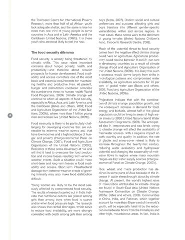 boys (Stern, 2007). Distinct social and cultural preferences and customs affecting girls and boys translate into different gender-specific vulnerabilities within and across regions. In most cases, these norms work to the detriment of young females (United Nations Children’s Fund, Innocenti Research Centre, 2008). Much of the potential threat to food security comes from the negative effect climate change could have on agriculture. Agricultural productivity could decline between 9 and 21 per cent in developing countries as a result of climate change (Food and Agriculture Organization of the United Nations, 2009b). It is likely that such a decrease would derive largely from shifts in hydrological patterns and compromised water availability, as agriculture accounts for 70 per cent of global water use (Bates and others, 2008; Food and Agriculture Organization of the United Nations, 2009a). Projections indicate that with the combination of climate change, population growth, and the consequent increase in demand for food, energy, and biofuels, almost half of the global population could be living in areas of high water stress by 2030 (United Nations World Water Assessment Programme, 2009). The anticipated rise in temperatures and sea levels owing to climate change will affect the availability of freshwater sources, with a negative impact on both quantity and quality. In addition, the rate of glacier and snow-cover retreat is likely to increase throughout the twenty-first century, reducing water availability and hydropower potential and changing the seasonality of meltwater flows in regions where major mountain ranges are key water supply sources (Intergovernmental Panel on Climate Change, 2007b). Rice, wheat, and maize production has declined in some parts of Asia because of the increase in water stress brought about by climate change. At present, the world’s highest rates of malnutrition attributable to climate change are found in South-East Asia (United Nations Framework Convention on Climate Change, 2007a; Bates and others, 2008). Communities in China, India, and Pakistan, which together account for more than 40 per cent of the world’s youth, will be especially hard hit by the reduction in meltwater flows from the Himalayas and other high, mountainous areas. In fact, India is