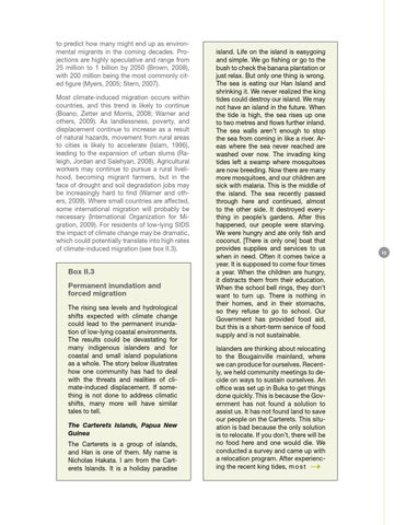 Box II.3 Permanent inundation and forced migration The rising sea levels and hydrological shifts expected with climate change could lead to the permanent inundation of low-lying coastal environments. The results could be devastating for many indigenous islanders and for coastal and small island populations as a whole. The story below illustrates how one community has had to deal with the threats and realities of climate-induced displacement. If something is not done to address climatic shifts, many more will have similar tales to tell. The Carterets Islands, Papua New Guinea The Carterets is a group of islands, and Han is one of them. My name is Nicholas Hakata. I am from the Carterets Islands. It is a holiday paradise
