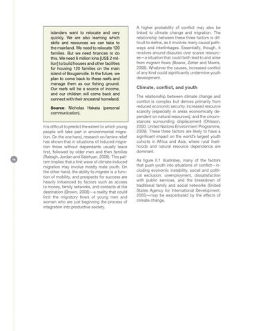 Climate, conflict, and youth The relationship between climate change and conflict is complex but derives primarily from reduced economic security, increased resource scarcity (especially in areas economically dependent on natural resources), and the circumstances surrounding displacement (Ohlsson, 2000; United Nations Environment Programme, 2009). These three factors are likely to have a significant impact on the world’s largest youth cohorts in Africa and Asia, where rural livelihoods and natural resource dependence are dominant. As figure II.1 illustrates, many of the factors that push youth into situations of conflict—including economic instability, social and political exclusion, unemployment, dissatisfaction with public services, and the breakdown of traditional family and social networks (United States Agency for International Development, 2005)—may be exacerbated by the effects of climate change.