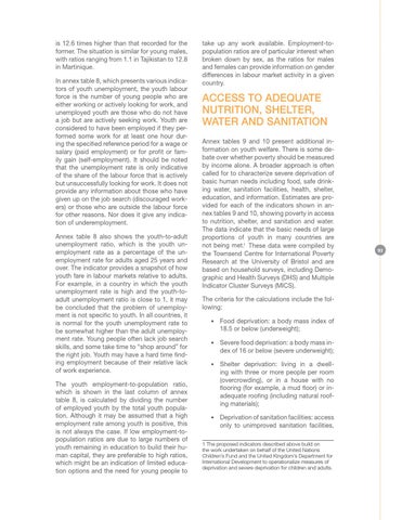 Access to adequate nutrition, shelter, water and sanitation Annex tables 9 and 10 present additional information on youth welfare. There is some debate over whether poverty should be measured by income alone. A broader approach is often called for to characterize severe deprivation of basic human needs including food, safe drinking water, sanitation facilities, health, shelter, education, and information. Estimates are provided for each of the indicators shown in annex tables 9 and 10, showing poverty in access to nutrition, shelter, and sanitation and water. The data indicate that the basic needs of large proportions of youth in many countries are not being met.1 These data were compiled by the Townsend Centre for International Poverty Research at the University of Bristol and are based on household surveys, including Demographic and Health Surveys (DHS) and Multiple Indicator Cluster Surveys (MICS). The criteria for the calculations include the following: •• F ood deprivation: a body mass index of 18.5 or below (underweight); •• S evere food deprivation: a body mass index of 16 or below (severe underweight); •• S helter deprivation: living in a dwelling with three or more people per room (overcrowding), or in a house with no flooring (for example, a mud floor) or inadequate roofing (including natural roofing materials); •• D eprivation of sanitation facilities: access only to unimproved sanitation facilities, 1 The proposed indicators described above build on the work undertaken on behalf of the United Nations Children’s Fund and the United Kingdom’s Department for International Development to operationalize measures of deprivation and severe deprivation for children and adults.