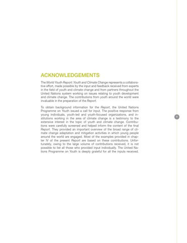 Acknowledgements The World Youth Report: Youth and Climate Change represents a collaborative effort, made possible by the input and feedback received from experts in the field of youth and climate change and from partners throughout the United Nations system working on issues relating to youth development and climate change. The contributions from youth around the world were invaluable in the preparation of the Report. To obtain background information for the Report, the United Nations Programme on Youth issued a call for input. The positive response from young individuals, youth-led and youth-focused organizations, and institutions working in the area of climate change is a testimony to the extensive interest in the topic of youth and climate change. Contributions were carefully screened and helped inform the content of the final Report. They provided an important overview of the broad range of climate change adaptation and mitigation activities in which young people around the world are engaged. Most of the examples provided in chapter IV of the present Report are based on these contributions. Unfortunately, owing to the large volume of contributions received, it is not possible to list all those who provided input individually. The United Nations Programme on Youth is deeply grateful for all the inputs received.