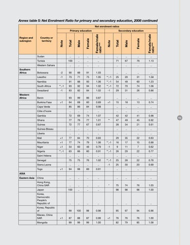 Annex table 5: Net Enrolment Ratio for primary and secondary education, 2008 continued Net enrolment ratios Primary education Region and subregion