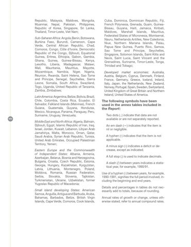 The following symbols have been used in the annex tables included in the Report: wo dots (..) indicate that data are not T available or are not separately reported. n em dash (—) indicates that the item is A nil or negligible. hyphen (-) indicates that the item is not A applicable. minus sign (-) indicates a deficit or deA crease, except as indicated. A full stop (.) is used to indicate decimals. slash (/) between years indicates a statisA tical year, for example, 1990/91. Use of a hyphen (-) between years, for example, 1990-1991, signifies the full period involved, including the beginning and end years. Details and percentages in tables do not necessarily add to totals, because of rounding. Annual rates of growth or change, unless otherwise stated, refer to annual compound rates.