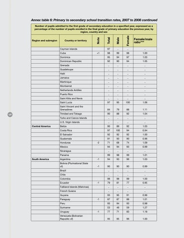 Annex table 6: Primary to secondary school transition rates, 2007 to 2008 continued Number of pupils admitted to the first grade of secondary education in a specified year, expressed as a percentage of the number of pupils enrolled in the final grade of primary education the previous year, by region, country and sex Region and subregion