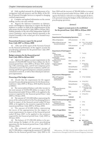 Chapter I: International peace and security (d) Fully justified rationale for all deployments of investigations staff and resources and the ability of the Office of Internal Oversight Services to respond to changing caseload requirements; (e) Complete and updated information on the current staffing, vacancy rate and caseload; 41. Requests the Advisory Committee on Administrative and Budgetary Questions to request the Board of Auditors to conduct an audit of the implementation of the pilot project for the period of 1 July 2009 to 30 June 2012, without prejudice to the role of the Independent Audit Advisory Committee, and to report thereon separately to the General Assembly at the second part of its resumed sixtysixth session; Financial performance report for the period from 1 July 2007 to 30 June 2008 42. Takes note of the report of the Secretary-General on the financial performance of the support account for peacekeeping operations for the period from 1 July 2007 to 30 June 2008; Budget estimates for the financial period from 1 July 2009 to 30 June 2010 43. Approves the support account requirements in the amount of 294,030,900 United States dollars for the financial period from 1 July 2009 to 30 June 2010, including 1,182 continuing posts, and 63 new temporary posts contained in annex I to the present resolution, and 83 continuing and 60 new general temporary assistance positions contained in annex II, as well as their related post and nonpost requirements; Financing of the budget estimates 44. Decides that the requirements for the support account for peacekeeping operations for the financial period from 1 July 2009 to 30 June 2010 shall be financed as follows: (a) The unencumbered balance and other income in the total amount of 15,056,300 dollars in respect of the financial period ended 30 June 2008, to be applied to the resources required for the financial period from 1 July 2009 to 30 June 2010; (b) The amount of 7,322,600 dollars representing the excess of the authorized level of the Peacekeeping Reserve Fund in respect of the financial period ended 30 June 2008, to be applied to the resources required for the financial period from 1 July 2009 to 30 June 2010; (c) The amount of 62,800 dollars representing the excess of the appropriation for the support account requirements in respect of the financial period ended 30 June 2007, to be applied to the resources required for the financial period from 1 July 2009 to 30 June 2010; (d) The balance of 271,589,200 dollars to be prorated among the budgets of the active peacekeeping operations for the financial period from 1 July 2009 to 30 June 2010; (e) The estimated staff assessment income of 28,273,500 dollars, comprising the amount of 27,486,900 dollars for the financial period from 1 July 2009 to 30