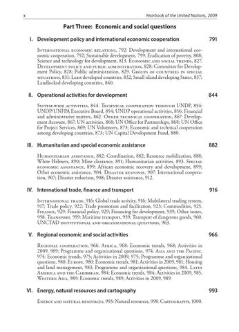 Humanitarian assistance, 882: Coordination, 882; Resource mobilization, 888; White Helmets, 890; Mine clearance, 891; Humanitarian activities, 893. Special economic assistance, 899: African economic recovery and development, 899; Other economic assistance, 904. Disaster response, 907: International cooperation, 907; Disaster reduction, 908; Disaster assistance, 912.