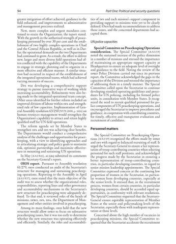 Part One: Political and security questions ties of dfs and each mission’s support component in providing support to missions were yet to be clearly defined. Oios had made recommendations to address those issues, and the concerned departments had accepted them. UN police capacities Special Committee on Peacekeeping Operations consideration. The Special Committee [A/63/19] noted the sustained increase of the police dimension in a number of missions and stressed the importance of maintaining an appropriate support capacity at Headquarters to ensure an adequate level of oversight and guidance to the field. Noting the review of the dpko Police Division carried out since its previous report, the Committee acknowledged the gaps in the capacities of the Division and stressed the importance of addressing them in a timely manner. The Special Committee called upon the Secretariat to continue developing standard operating guidelines and procedures for UN policing, including for formed police units, in consultation with Member States. It recognized the need to recruit qualified personnel for police components of UN peacekeeping operations, and encouraged the Secretariat to improve procedures and guidance, in cooperation with contributing countries, for timely, effective and transparent evaluation and recruitment of candidates. Personnel matters The Special Committee on Peacekeeping Operations [A/63/19] recognized the efforts made by dpko and dfs with regard to balanced recruiting of staff. It urged the Secretary-General to ensure a fair representation of troop-contributing countries when selecting personnel for such staff positions, and acknowledged the progress made by the Secretariat in ensuring a better representation of troop-contributing countries, in particular developing countries, in regard to senior mission leadership appointments. The Special Committee expressed concern at the continuing low proportion of women in the Secretariat, in particular women from developing countries, especially at the senior levels. It stressed that, in the recruitment process, women from certain countries, in particular developing countries, should be accorded equal opportunities, in conformity with relevant resolutions. The Special Committee requested that the SecretaryGeneral ensure equitable representation of Member States at the senior and policymaking levels of the Secretariat, especially those with inadequate representation at those levels. Concerned about the high number of vacancies in peacekeeping missions, the Special Committee requested that the Secretariat accelerate the recruitment
