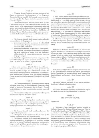 Composition Article 23 1 1. The Security Council shall consist of fifteen Members of the United Nations. The Republic of China, France, the Union of Soviet Socialist Republics, the United Kingdom of Great Britain and Northern Ireland and the United States of America shall be permanent members of the Security Council. The General Assembly shall elect ten other Members of the United Nations to be nonpermanent members of the Security Council, due regard being specially paid, in the first instance to the contribution of Members of the United Nations to the maintenance of international peace and security and to the other purposes of the Organization, and also to equitable geographical distribution.