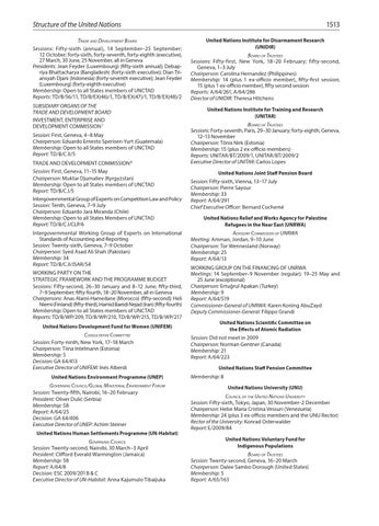 Structure of the United Nations Trade and Development Board Sessions: Fifty-sixth (annual), 14 September–25 September; 12 October; forty-sixth, forty-seventh, forty-eighth (executive), 27 March, 30 June, 25 November, all in Geneva Presidents: Jean Feyder (Luxembourg) (fifty-sixth annual); Debapriya Bhattacharya (Bangladesh) (forty-sixth executive); Dian Triansyah Djani (Indonesia) (forty-seventh executive); Jean Feyder (Luxembourg) (forty-eighth executive) Membership: Open to all States members of UNCTAD Reports: TD/B/56/11, TD/B/EX(46)/1, TD/B/EX(47)/1, TD/B/EX(48)/2 SUBSIDIARY ORGANS OF THE TRADE AND DEVELOPMENT BOARD INVESTMENT, ENTERPRISE AND DEVELOPMENT COMMISSION 7 Session: First, Geneva, 4–8 May Chairperson: Eduardo Ernesto Sperisen-Yurt (Guatemala) Membership: Open to all States members of UNCTAD Report: TD/B/C.II/5 TRADE AND DEVELOPMENT COMMISSION 8 Session: First, Geneva, 11–15 May Chairperson: Muktar Djumaliev (Kyrgyzstan) Membership: Open to all States members of UNCTAD Report: TD/B/C.I/5 Intergovernmental Group of Experts on Competition Law and Policy Session: Tenth, Geneva, 7–9 July Chairperson: Eduardo Jara Miranda (Chile) Membership: Open to all States Members of UNCTAD Report: TD/B/C.I/CLP/6 Intergovernmental Working Group of Experts on International Standards of Accounting and Reporting Session: Twenty-sixth, Geneva, 7–9 October Chairperson: Syed Asad Ali Shah (Pakistan) Membership: 34 Report: TD/B/C.II/ISAR/54 WORKING PARTY ON THE STRATEGIC FRAMEWORK AND THE PROGRAMME BUDGET Sessions: Fifty-second, 26–30 January and 8–12 June; fifty-third, 7–9 September; fifty-fourth, 18–20 November, all in Geneva Chairpersons: Anas Alami-Hamedane (Morocco) (fifty-second); Heli Niemi (Finland) (fifty-third), Hamid Baeidi Nejad (Iran) (fifty-fourth) Membership: Open to all States members of UNCTAD Reports: TD/B/WP/209, TD/B/WP/210, TD/B/WP/215, TD/B/WP/217 United Nations Development Fund for Women (UNIFEM)