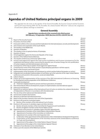 Agendas of United Nations principal organs in 2009 This appendix lists the items on the agendas of the General Assembly, the Security Council and the Economic and Social Council during 2009. For the Assembly, the column headed “Allocation” indicates the assignment of each item to plenary meetings or committees.