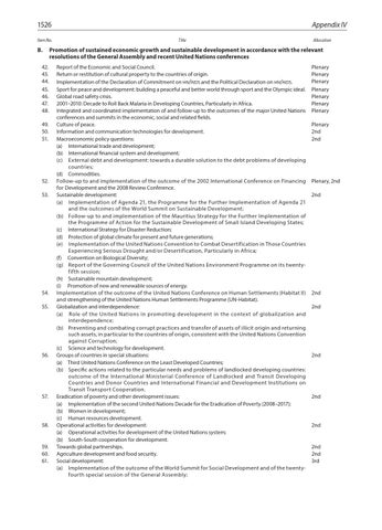 Report of the Economic and Social Council. Return or restitution of cultural property to the countries of origin. Implementation of the Declaration of Commitment on hiv/aids and the Political Declaration on hiv/aids. Sport for peace and development: building a peaceful and better world through sport and the Olympic ideal. Global road safety crisis. 2001–2010: Decade to Roll Back Malaria in Developing Countries, Particularly in Africa. Integrated and coordinated implementation of and follow-up to the outcomes of the major United Nations conferences and summits in the economic, social and related fields. Culture of peace. Information and communication technologies for development. Macroeconomic policy questions: (a) International trade and development; (b) International financial system and development; (c) External debt and development: towards a durable solution to the debt problems of developing countries; (d) Commodities. Follow-up to and implementation of the outcome of the 2002 International Conference on Financing for Development and the 2008 Review Conference. Sustainable development: (a) Implementation of Agenda 21, the Programme for the Further Implementation of Agenda 21 and the outcomes of the World Summit on Sustainable Development; (b) Follow-up to and implementation of the Mauritius Strategy for the Further Implementation of the Programme of Action for the Sustainable Development of Small Island Developing States; (c) International Strategy for Disaster Reduction; (d) Protection of global climate for present and future generations; (e) Implementation of the United Nations Convention to Combat Desertification in Those Countries Experiencing Serious Drought and/or Desertification, Particularly in Africa; (f) Convention on Biological Diversity; (g) Report of the Governing Council of the United Nations Environment Programme on its twentyfifth session; (h) Sustainable mountain development; (i) Promotion of new and renewable sources of energy. Implementation of the outcome of the United Nations Conference on Human Settlements (Habitat II) and strengthening of the United Nations Human Settlements Programme (UN-Habitat). Globalization and interdependence: (a) Role of the United Nations in promoting development in the context of globalization and interdependence; (b) Preventing and combating corrupt practices and transfer of assets of illicit origin and returning such assets, in particular to the countries of origin, consistent with the United Nations Convention against Corruption; (c) Science and technology for development. Groups of countries in special situations: (a) Third United Nations Conference on the Least Developed Countries; (b) Specific actions related to the particular needs and problems of landlocked developing countries: outcome of the International Ministerial Conference of Landlocked and Transit Developing Countries and Donor Countries and International Financial and Development Institutions on Transit Transport Cooperation. Eradication of poverty and other development issues: (a) Implementation of the second United Nations Decade for the Eradication of Poverty (2008–2017); (b) Women in development; (c) Human resources development. Operational activities for development: (a) Operational activities for development of the United Nations system; (b) South-South cooperation for development. Towards global partnerships. Agriculture development and food security. Social development: (a) Implementation of the outcome of the World Summit for Social Development and of the twentyfourth special session of the General Assembly;