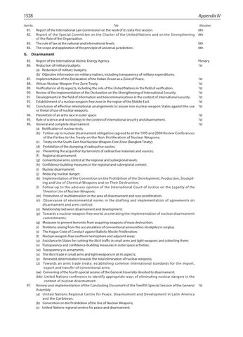 Report of the International Atomic Energy Agency. Reduction of military budgets: (a) Reduction of military budgets; (b) Objective information on military matters, including transparency of military expenditures. Implementation of the Declaration of the Indian Ocean as a Zone of Peace. African Nuclear-Weapon-Free Zone Treaty. Verification in all its aspects, including the role of the United Nations in the field of verification. Review of the implementation of the Declaration on the Strengthening of International Security. Developments in the field of information and telecommunications in the context of international security. Establishment of a nuclear-weapon-free zone in the region of the Middle East. Conclusion of effective international arrangements to assure non-nuclear weapon States against the use or threat of use of nuclear weapons. Prevention of an arms race in outer space. Role of science and technology in the context of international security and disarmament. General and complete disarmament: (a) Notification of nuclear tests; (b) Follow-up to nuclear disarmament obligations agreed to at the 1995 and 2000 Review Conferences of the Parties to the Treaty on the Non-Proliferation of Nuclear Weapons; (c) Treaty on the South-East Asia Nuclear-Weapon-Free Zone (Bangkok Treaty); (d) Prohibition of the dumping of radioactive wastes; (e) Preventing the acquisition by terrorists of radioactive materials and sources; (f) Regional disarmament; (g) Conventional arms control at the regional and subregional levels; (h) Confidence-building measures in the regional and subregional context; (i) Nuclear disarmament; (j) Reducing nuclear danger; (k) Implementation of the Convention on the Prohibition of the Development, Production, Stockpiling and Use of Chemical Weapons and on Their Destruction; (l) Follow-up to the advisory opinion of the International Court of Justice on the Legality of the Threat or Use of Nuclear Weapons; (m) Promotion of multilateralism in the area of disarmament and non-proliferation; (n) Observance of environmental norms in the drafting and implementation of agreements on disarmament and arms control; (o) Relationship between disarmament and development; (p) Towards a nuclear-weapon-free world: accelerating the implementation of nuclear disarmament commitments; (q) Measures to prevent terrorists from acquiring weapons of mass destruction; (r) Problems arising from the accumulation of conventional ammunition stockpiles in surplus; (s) The Hague Code of Conduct against Ballistic Missile Proliferation; (t) Nuclear-weapon-free southern hemisphere and adjacent areas; (u) Assistance to States for curbing the illicit traffic in small arms and light weapons and collecting them; (v) Transparency and confidence-building measures in outer space activities; (w) Transparency in armaments; (x) The illicit trade in small arms and light weapons in all its aspects; (y) Renewed determination towards the total elimination of nuclear weapons; (z) Towards an arms trade treaty: establishing common international standards for the import, export and transfer of conventional arms; (aa) Convening of the fourth special session of the General Assembly devoted to disarmament; (bb) United Nations conference to identify appropriate ways of eliminating nuclear dangers in the context of nuclear disarmament. Review and implementation of the Concluding Document of the Twelfth Special Session of the General Assembly: (a) United Nations Regional Centre for Peace, Disarmament and Development in Latin America and the Caribbean; (b) Convention on the Prohibition of the Use of Nuclear Weapons; (c) United Nations regional centres for peace and disarmament;