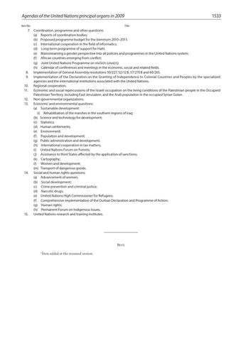 7. Coordination, programme and other questions: (a) Reports of coordination bodies; (b) Proposed programme budget for the biennium 2010–2011; (c) International cooperation in the field of informatics; (d) Long-term programme of support for Haiti; (e) Mainstreaming a gender perspective into all policies and programmes in the United Nations system; (f) African countries emerging from conflict; (g) Joint United Nations Programme on hiv/aids (unaids); (h) Calendar of conferences and meetings in the economic, social and related fields. 8. Implementation of General Assembly resolutions 50/227, 52/12 B, 57/270 B and 60/265. 9. Implementation of the Declaration on the Granting of Independence to Colonial Countries and Peoples by the specialized agencies and the international institutions associated with the United Nations. 10. Regional cooperation. 11. Economic and social repercussions of the Israeli occupation on the living conditions of the Palestinian people in the Occupied Palestinian Territory, including East Jerusalem, and the Arab population in the occupied Syrian Golan. 12. Non-governmental organizations. 13. Economic and environmental questions: (a) Sustainable development: (i) Rehabilitation of the marshes in the southern regions of Iraq; (b) Science and technology for development; (c) Statistics; (d) Human settlements; (e) Environment; (f) Population and development; (g) Public administration and development; (h) International cooperation in tax matters; (i) United Nations Forum on Forests; (j) Assistance to third States affected by the application of sanctions; (k) Cartography; (l) Women and development; (m) Transport of dangerous goods. 14. Social and human rights questions: (a) Advancement of women; (b) Social development; (c) Crime prevention and criminal justice; (d) Narcotic drugs; (e) United Nations High Commissioner for Refugees; (f) Comprehensive implementation of the Durban Declaration and Programme of Action; (g) Human rights; (h) Permanent Forum on Indigenous Issues. 15. United Nations research and training institutes.