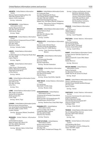 MASERU. United Nations Information Centre United Nations Road UN House (P.O. Box 301, Maseru 100) Maseru, Lesotho KHARTOUM. United Nations Information Serving: Lesotho Centre United Nations Compound House #7, Blk 5 MEXICO CITY. United Nations Information Gamma’a Avenue Centre (P.O. Box 1992) Montes Urales 440 (3rd floor) Khartoum, Sudan Colonia Lomas de Chapultepec Serving: Somalia, Sudan Mexico City, D.F. 11000, Mexico Serving: Cuba, Dominican Republic, LAGOS. United Nations Information Mexico Centre 17 Alfred Rewane (ex Kingsway) Road, Ikoyi MOSCOW. United Nations Information (P.O. Box 1068) Centre Lagos, Nigeria 4/16 Glazovsky Pereulok Serving: Nigeria Moscow 119002, Russian Federation LA PAZ. United Nations Information Serving: Russian Federation Centre Calle 14 esq. S. Bustamante NAIROBI. United Nations Information Edificio Metrobol II, Calacoto Centre (Apartado Postal 9072) United Nations Office, Gigiri La Paz, Bolivia (P.O. Box 67578-00200) Serving: Bolivia Nairobi, Kenya Serving: Kenya, Seychelles, Uganda LIMA. United Nations Information Centre Lord Cochrane 130 NEW DELHI. United Nations Information San Isidro (L-27) Centre (P.O. Box 14-0199) 55 Lodi Estate Lima, Peru New Delhi 110 003, India Serving: Peru Serving: Bhutan, India LOME. United Nations Information Centre 468, Angle rue Atime Avenue de la Liberation (Boite postale 911) Lome, Togo Serving: Benin, Togo LUSAKA. United Nations Information Centre Revenue House (Ground floor) Cnr. Great North and Kalambo Roads (P.O. Box 32905, Lusaka 10101) Lusaka, Zambia Serving: Botswana, Malawi, Swaziland, Zambia