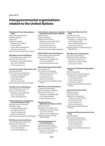 United Nations Educational, Scientific and Cultural Organization (UNESCO) UNESCO House 7 place de Fontenoy 75352 Paris 07-SP, France Telephone: (33) (1) 45-68-10-00 Fax: (33) (1) 45-67-16-90 E-mail: info@unesco.org Internet: www.unesco.org Director General: Irina Bokova (Bulgaria)