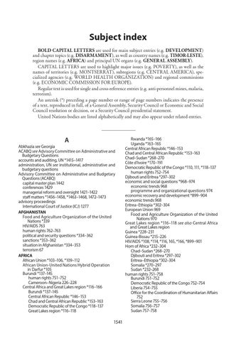 Subject index BOLD CAPITAL LETTERS are used for main subject entries (e.g. DEVELOPMENT) and chapter topics (e.g. DISARMAMENT), as well as country names (e.g. TIMOR-LESTE), region names (e.g. AFRICA) and principal UN organs (e.g. GENERAL ASSEMBLY). CAPITAL LETTERS are used to highlight major issues (e.g. POVERTY), as well as the names of territories (e.g. MONTSERRAT), subregions (e.g. CENTRAL AMERICA), specialized agencies (e.g. WORLD HEALTH ORGANIZATION) and regional commissions (e.g. ECONOMIC COMMISSION FOR EUROPE). Regular text is used for single and cross-reference entries (e.g. anti-personnel mines, malaria, terrorism). An asterisk (*) preceding a page number or range of page numbers indicates the presence of a text, reproduced in full, of a General Assembly, Security Council or Economic and Social Council resolution or decision, or a Security Council presidential statement. United Nations bodies are listed alphabetically and may also appear under related entries.